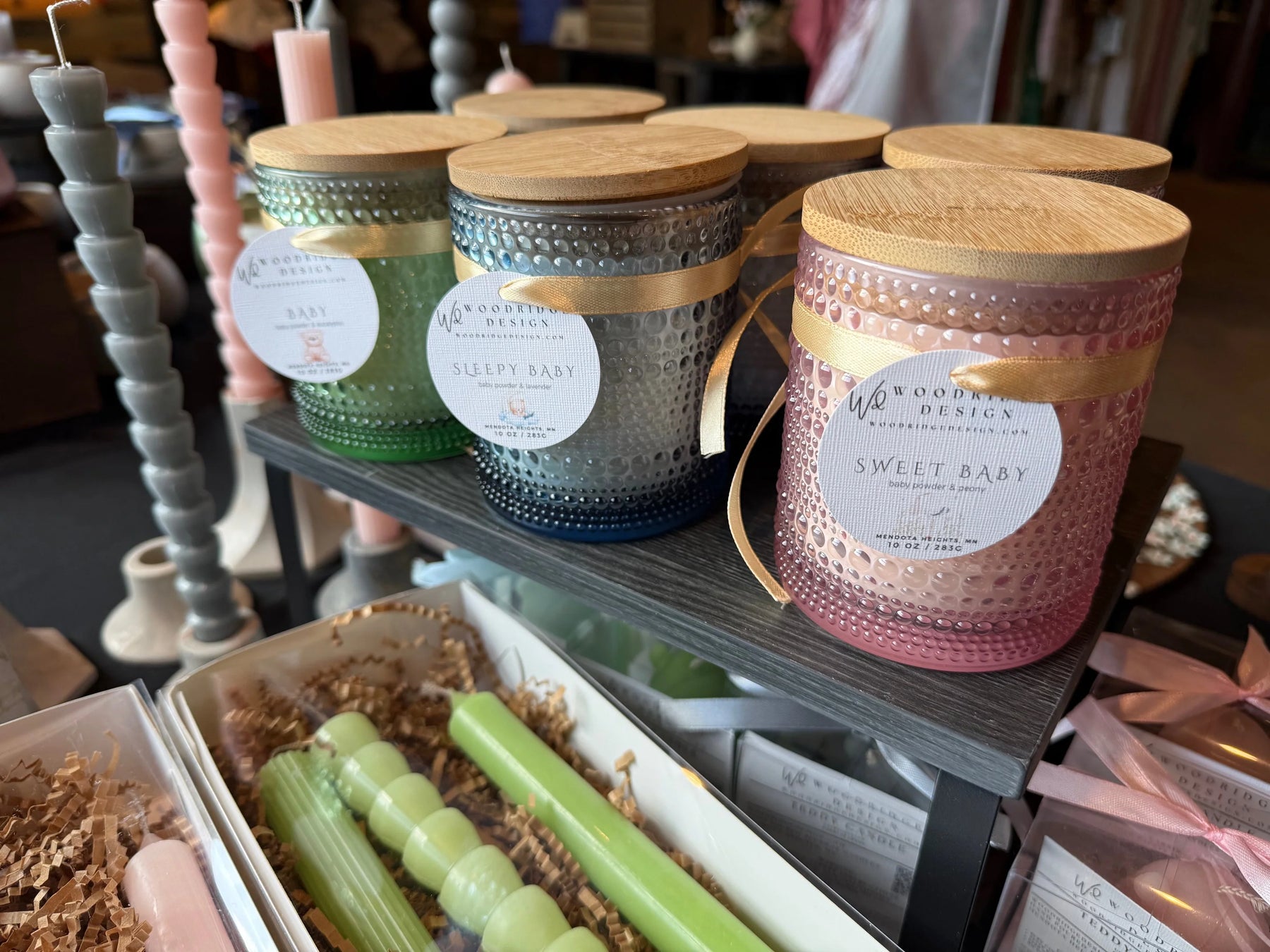 These beautiful Baby Bubble Glass Candles are hand poured in small batches in Mendota Heights, MN by a mom and her son. They make a perfect baby shower gift or new mom gift - immerse in the gentle scents of baby powder and eucalptus, peony or lavender essential oil.