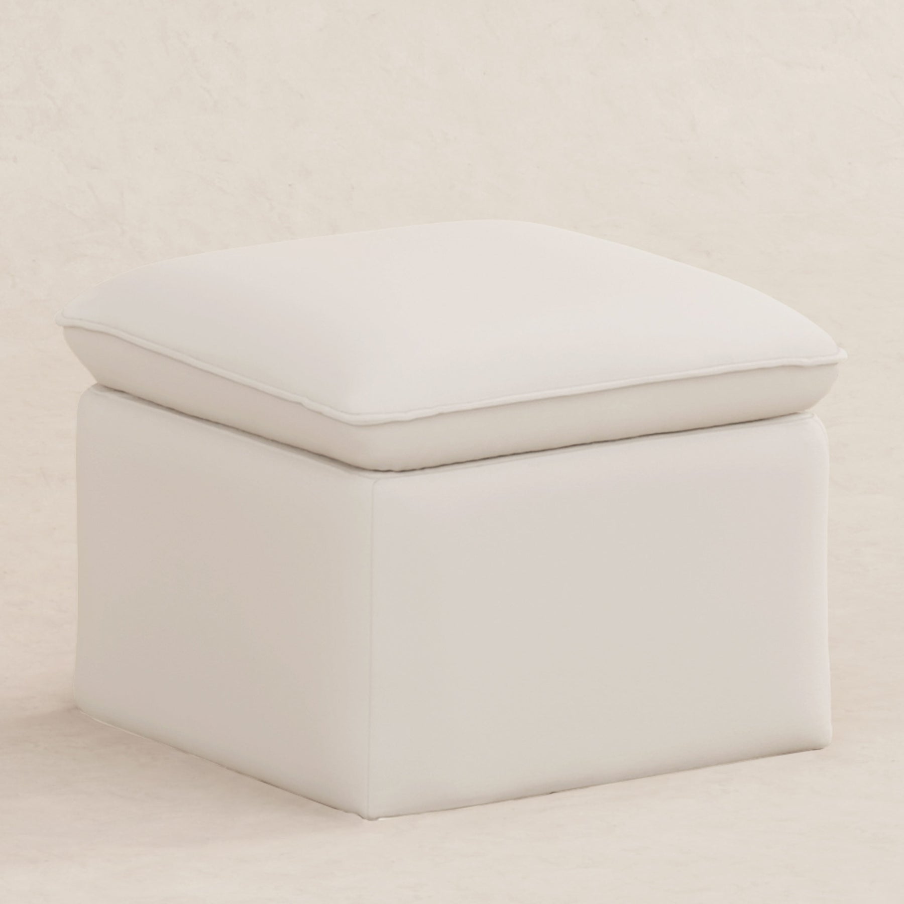 The Cali Storage Ottoman is the perfect blend of style and function. This versatile piece has ample storage for all your baby's extra toys, blankets and more. The easy to lift lid is supported by a soft open and close mechanism to help prevent little fingers getting caught. Upholstered by hand in our eco-performance fabric, this trendy ottoman can be paired with the Cali Swivel Glider to create a statement piece in your nursery or home.