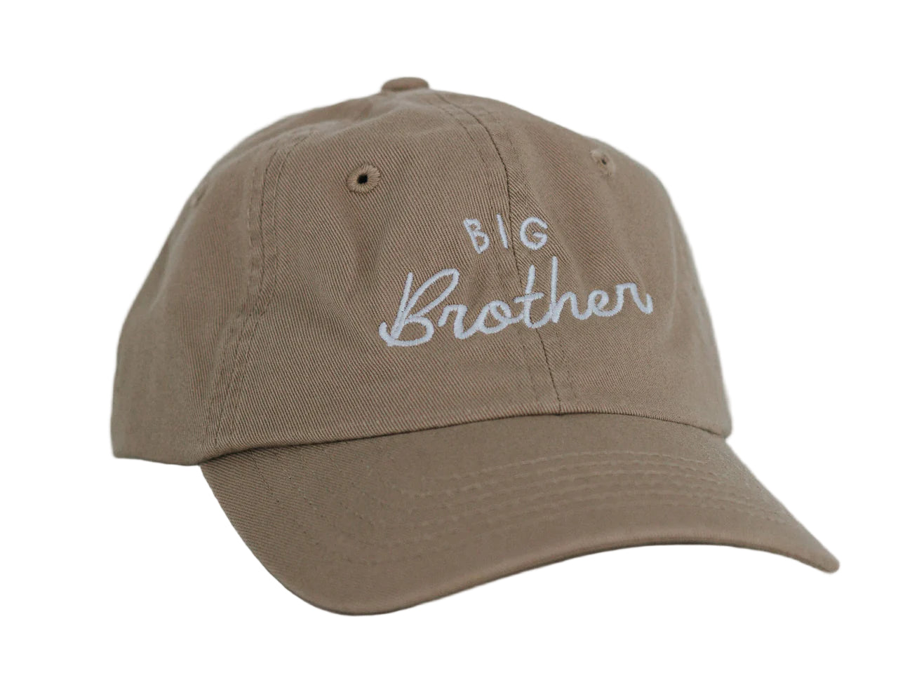 The perfect cap for proud big brothers! These embroidered hats are the perfect stylish accessory for big brothers, new brothers, exciting announcements, and photo shoots! Featuring modern typography in crisp white thread, our original "Big Brother" design is a fun, personalized accessory for little guys to enjoy. Soft cotton twill is featured in a perfect khaki neutral.