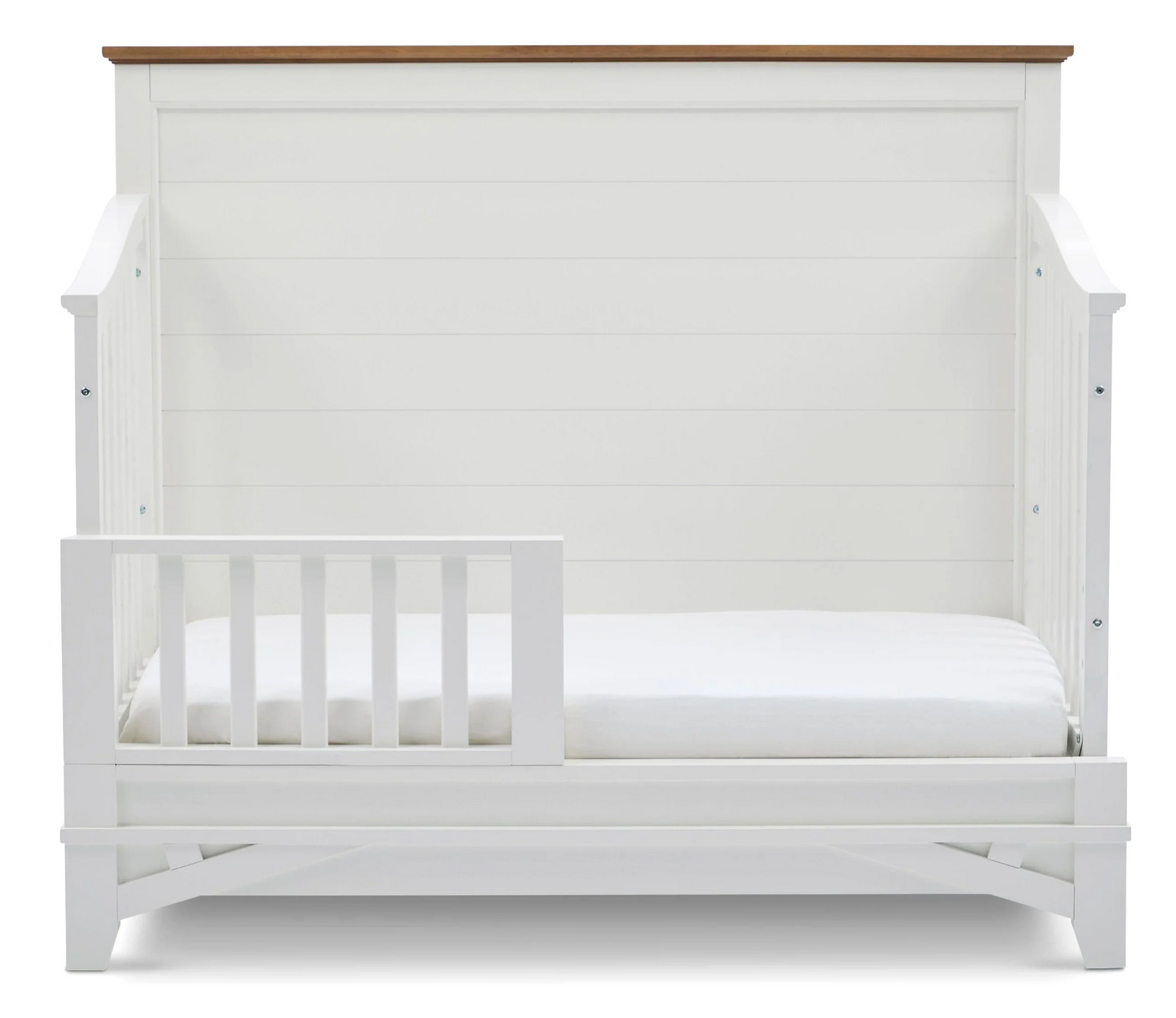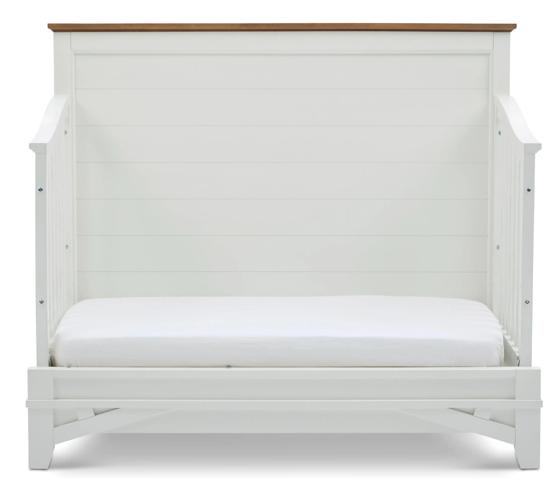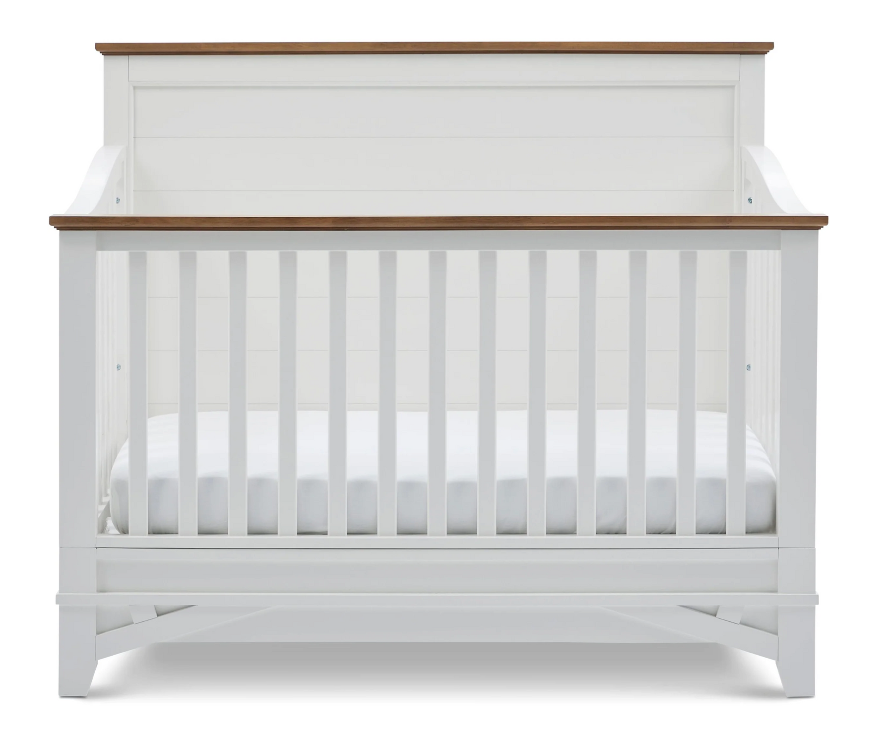 The heart of your nursery, the Heritage Artisan Convertible Crib combines clean lines with a farmhouse-inspired silhouette. Its elevated design includes a linen white finish with a warm oak cap rail, crafted from solid poplar hardwood for long-lasting durability. As your baby grows, this 4-in-1 crib effortlessly converts into a toddler bed, daybed, and a stylish full-size platform bed using the available conversion kit.