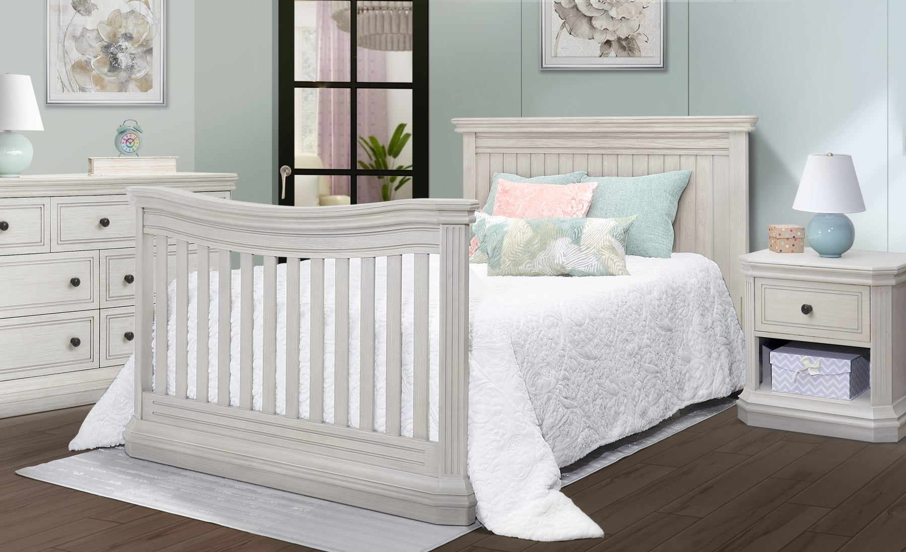Vista Flat Top 4-in-1 Convertible Crib features a four-in one design that transforms form a crib to a toddler bed with the additional purchase of the Toddle Rail (#136), a day bed and finally into a full size bed with the additional purchase of the Full Size Rails (#215). The Flat headboard, with sloping foot board and beveled corners offer functionality as well as elegance. With its durable finish with fine details, this crib will be a stylish addition to you child’s nursey. Made of solid poplar wood for strength, the crib meets all ASTM and CPSC safety standards and is JPMA Certified.