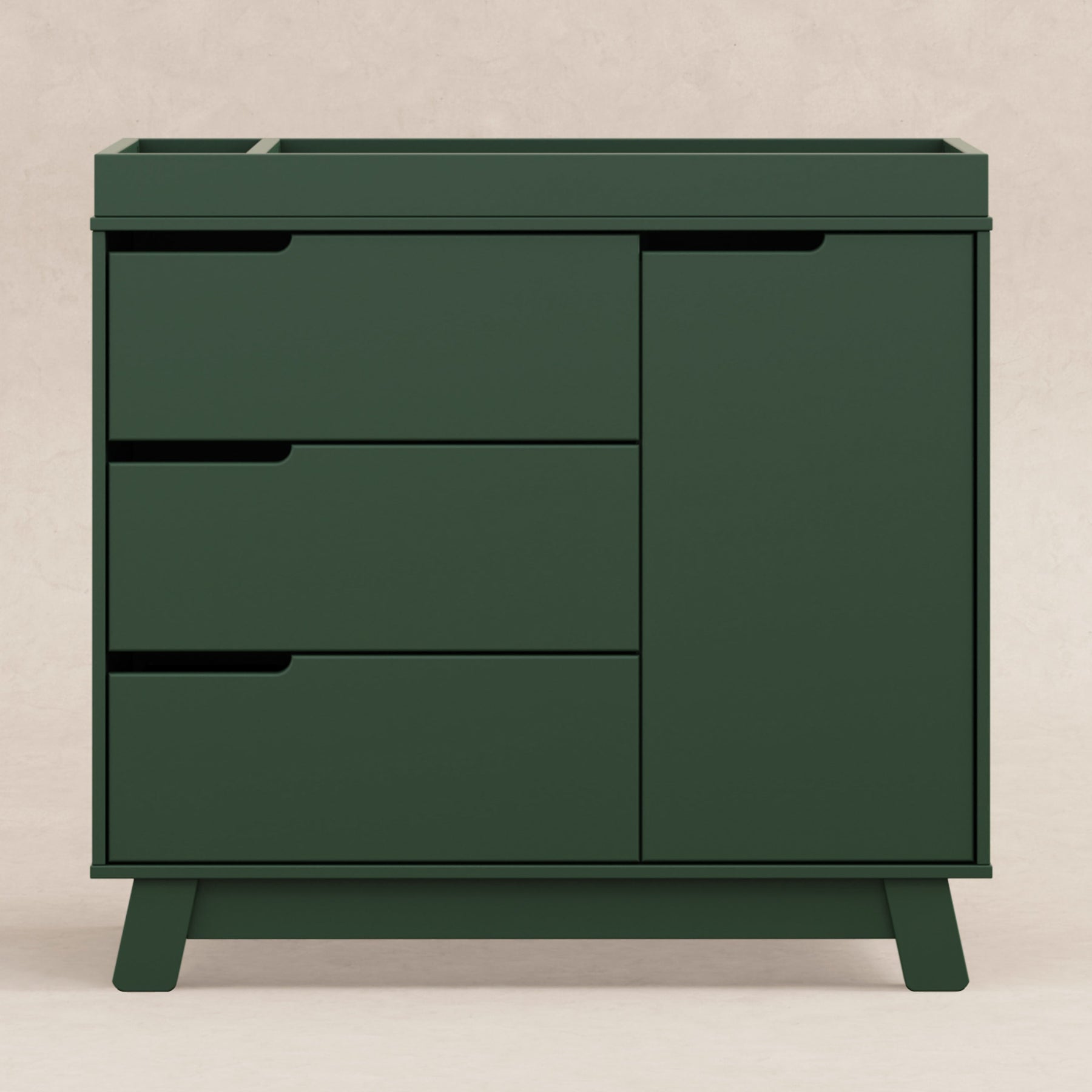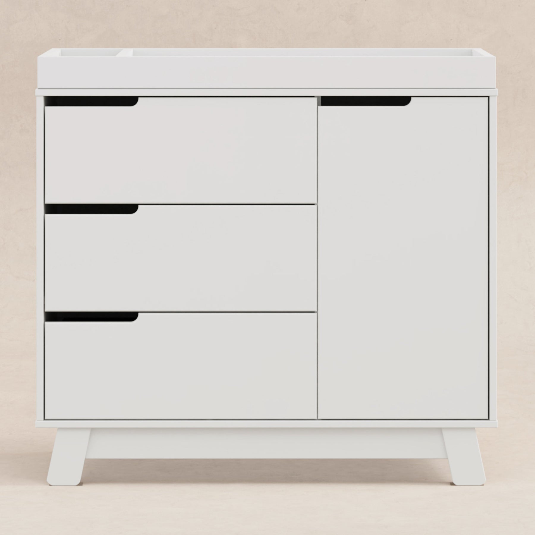 Get more from your nursery furniture with the versatile Hudson Changer Dresser. Combining a changing table, three drawer dresser, and storage cabinet all in one solid and practical package, the Hudson Changer Dresser is a modern space-saving convenience. Complementing the mid-century modern-inspired Hudson 3-in-1 Convertible Crib, the dresser comes in three chic finishes including two new takes on two-tone for the nursery. Truly built for baby, the removable changer tray's raised sides help keep your little one safe, and an anti-tip kit is included for further security. Keep baby's clothes and necessities organized in the smooth-opening drawers, while stop mechanisms prevent them from being pulled all of the way out. The storage cabinet closes gently and includes an adjustable shelf, perfect for keeping diapers and wipes handy.