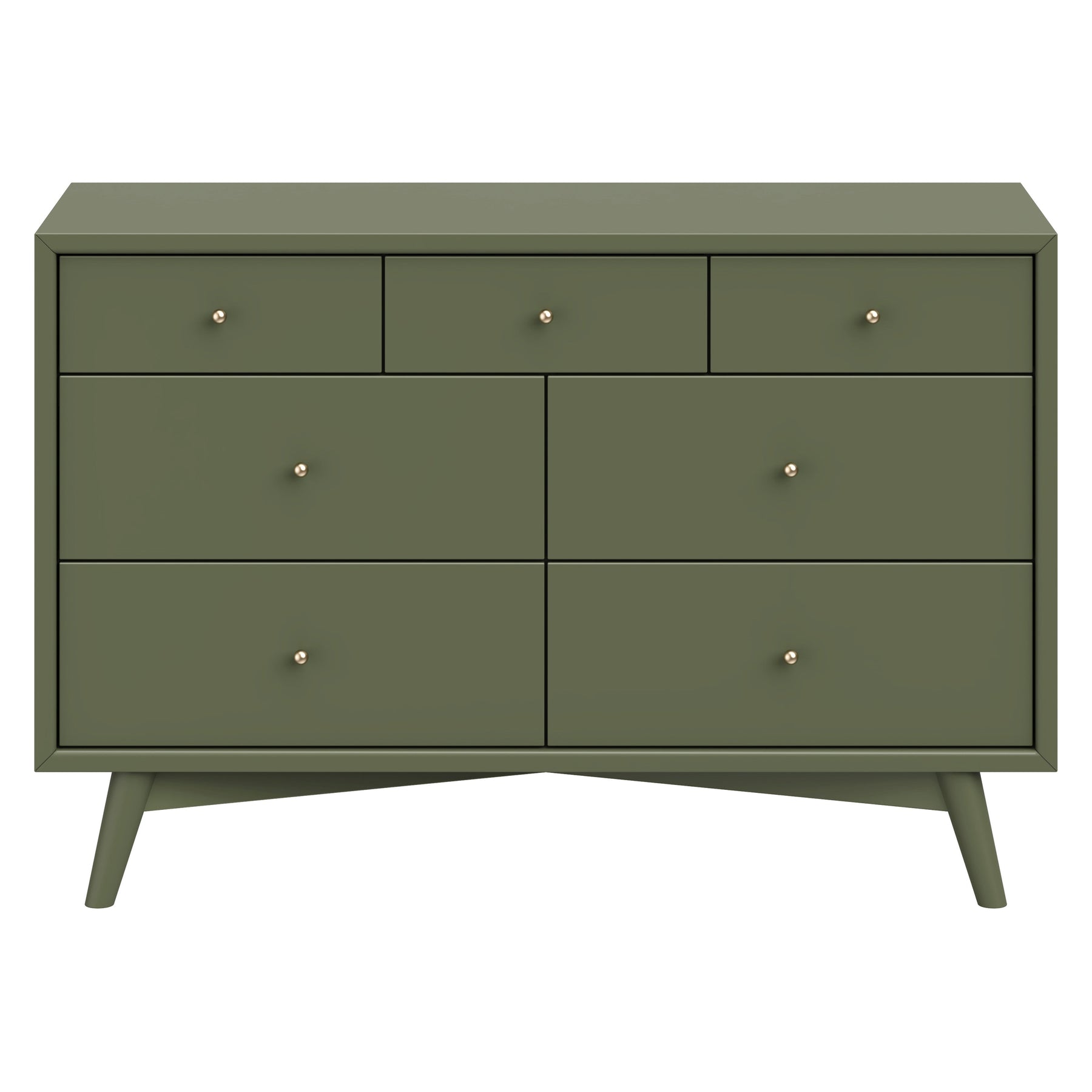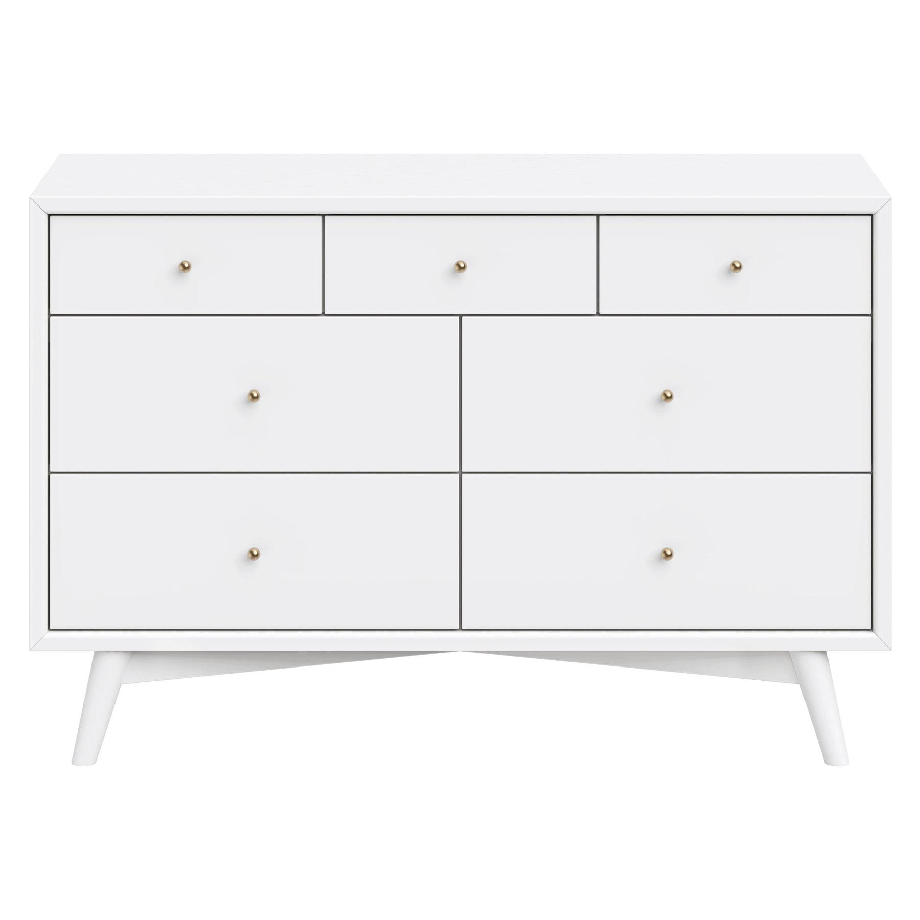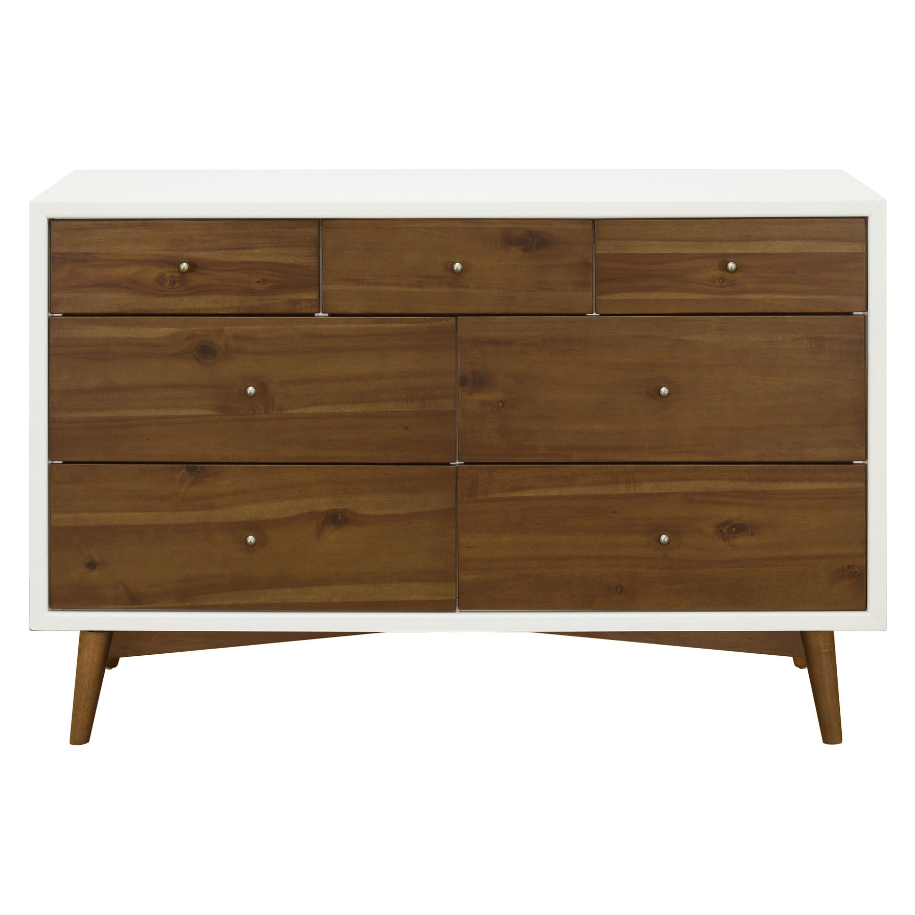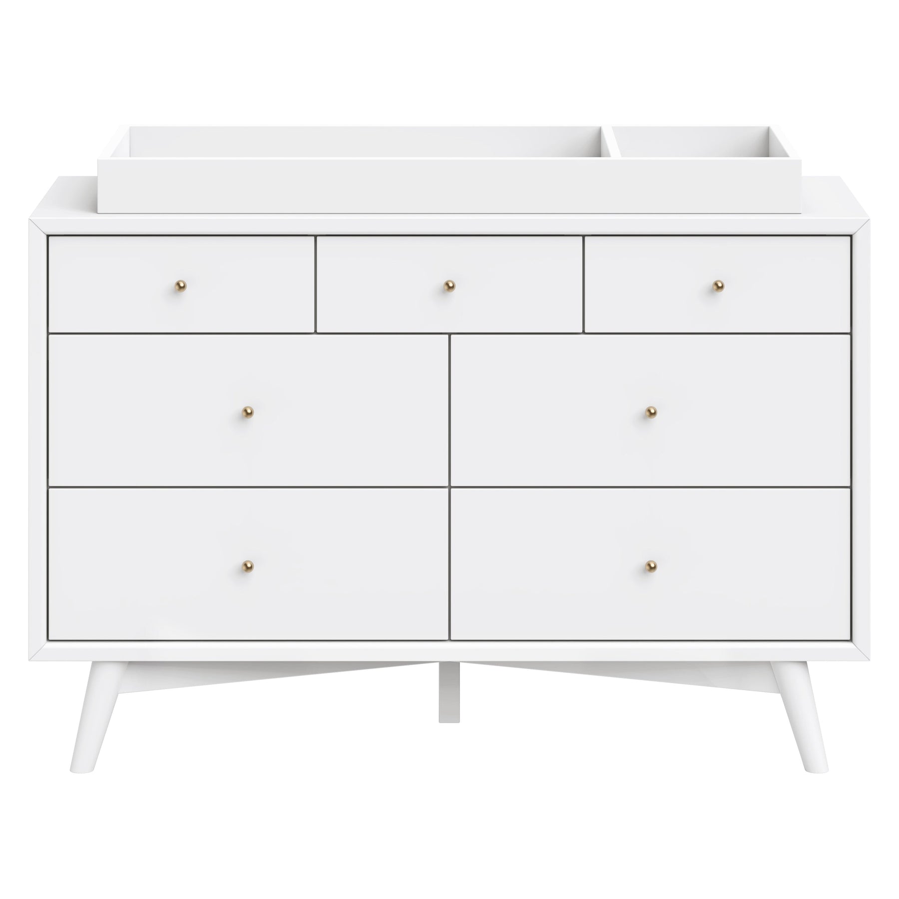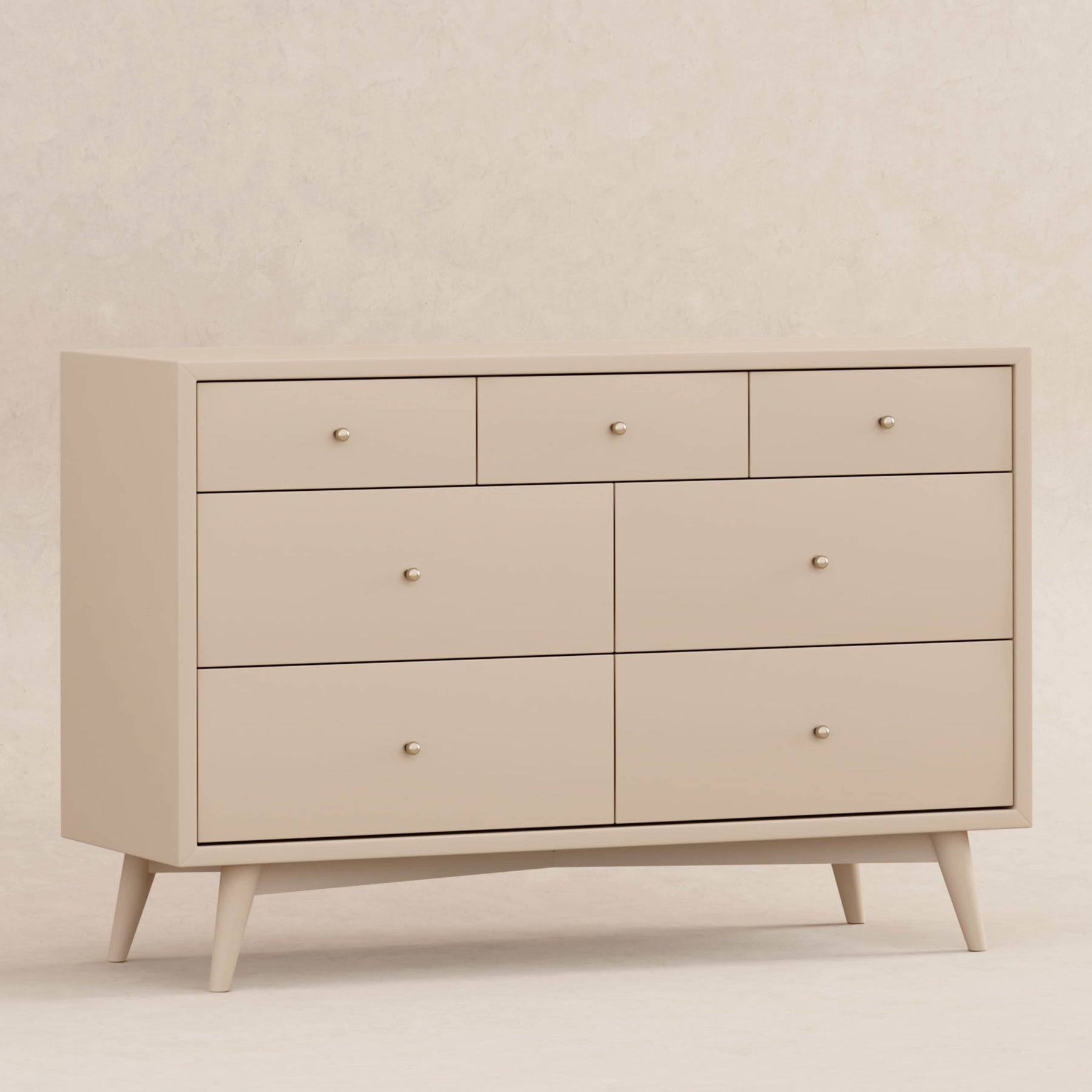 The Palma 7-drawer Double Dresser is a sophisticated mid-century inspired design with contrasting walnut stained drawers, tapered legs, brushed metal hardware, and smooth-glide drawers. It's a versatile modern piece, providing ample storage space with three top drawers and four larger bottom drawers. Pair with the Palma 4-in-1 Crib or Peggy 3-in-1 Crib for an elegant nursery.