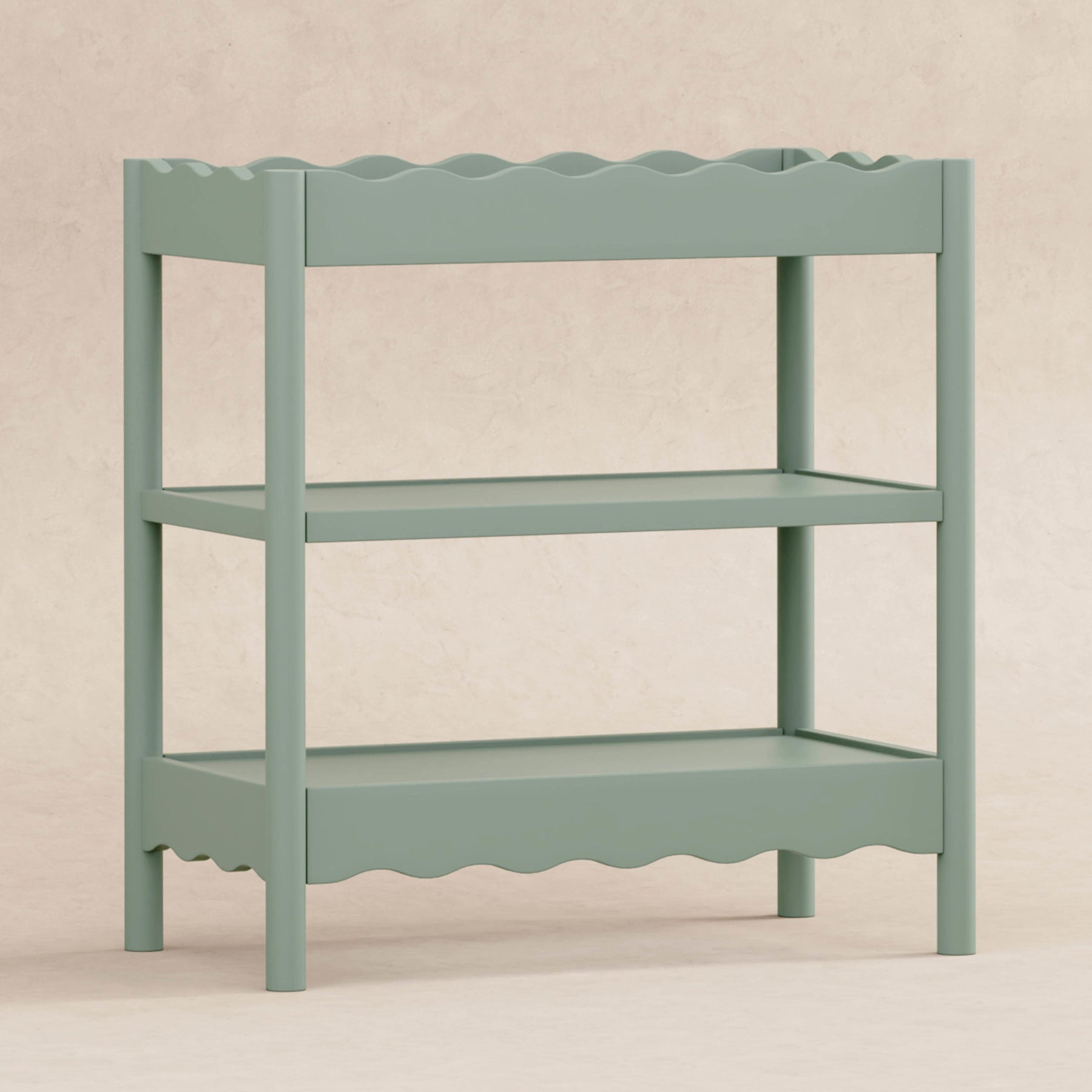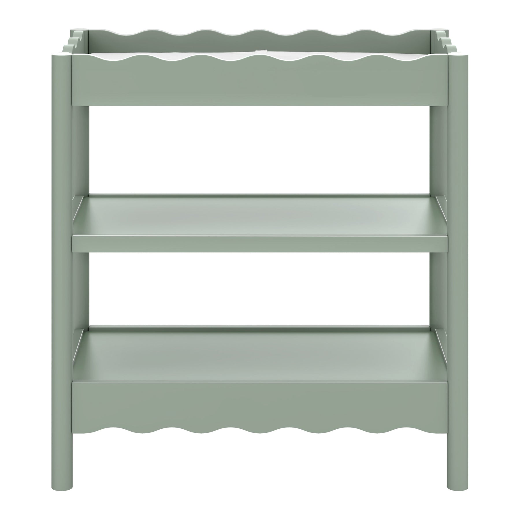 With rounded posts and wave-like edges, the Swell Changing Table has a modern appeal with an ocean-inspired design that pairs perfectly with your Swell Crib. It features two spacious, open shelves to keep all your baby’s diaper changing needs within easy reach for convenient changings.