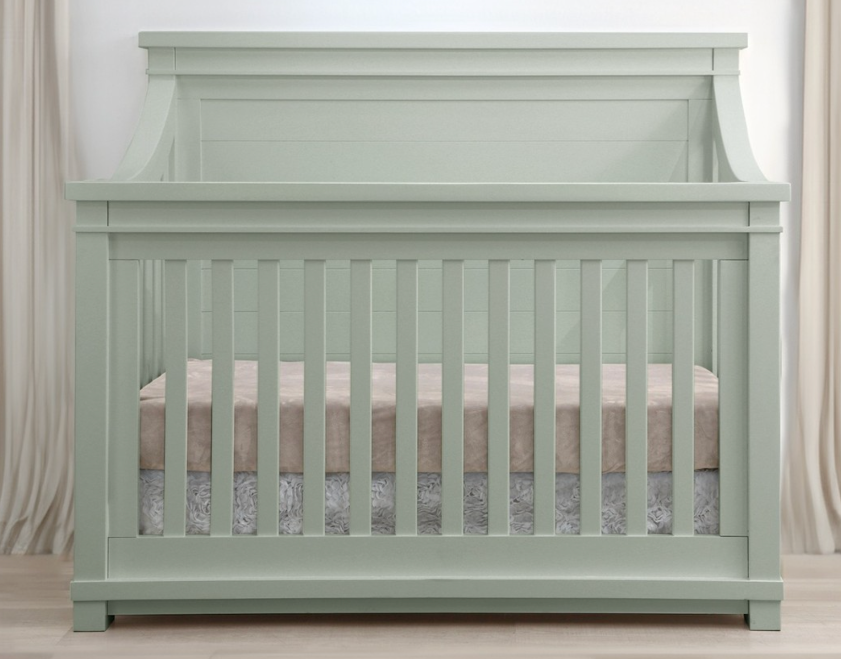 Solid and sturdy panels shape the striking Rowan Crib. The Baby Appleseed Rowan Flat Top Crib, revolutionizes the new, modern nursery. Crafted from sustainable, solid poplar wood, it creates the ideal bed for your child with alluring curves. Available in a soothing Sage finish—a modern take on timeless elegance. With its clean lines and soft green hue, this crib brings a calming vibe to any nursery while making a bold statement with its size and craftsmanship. nature, allow your little ones to dream safely in the Appleseed Rowan Convertible Crib.