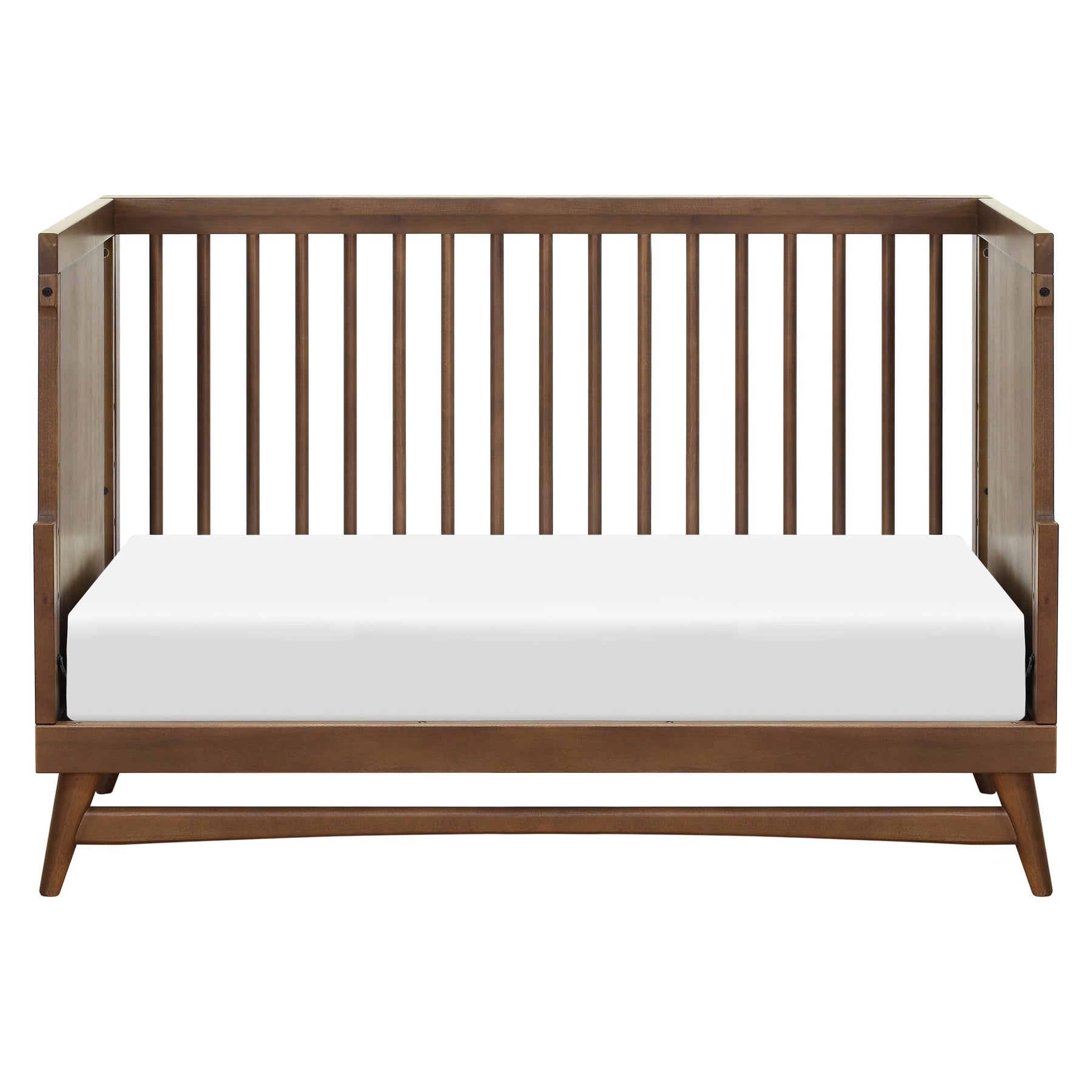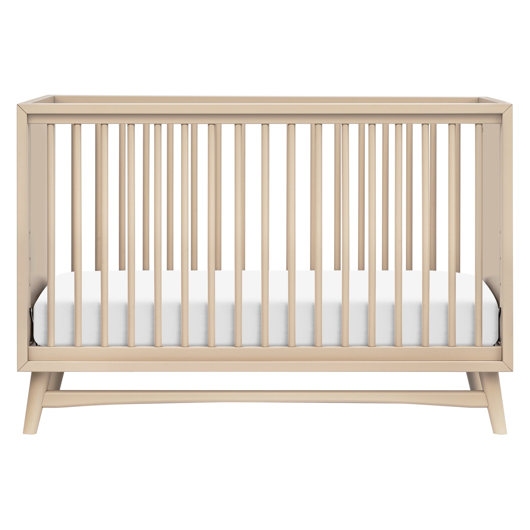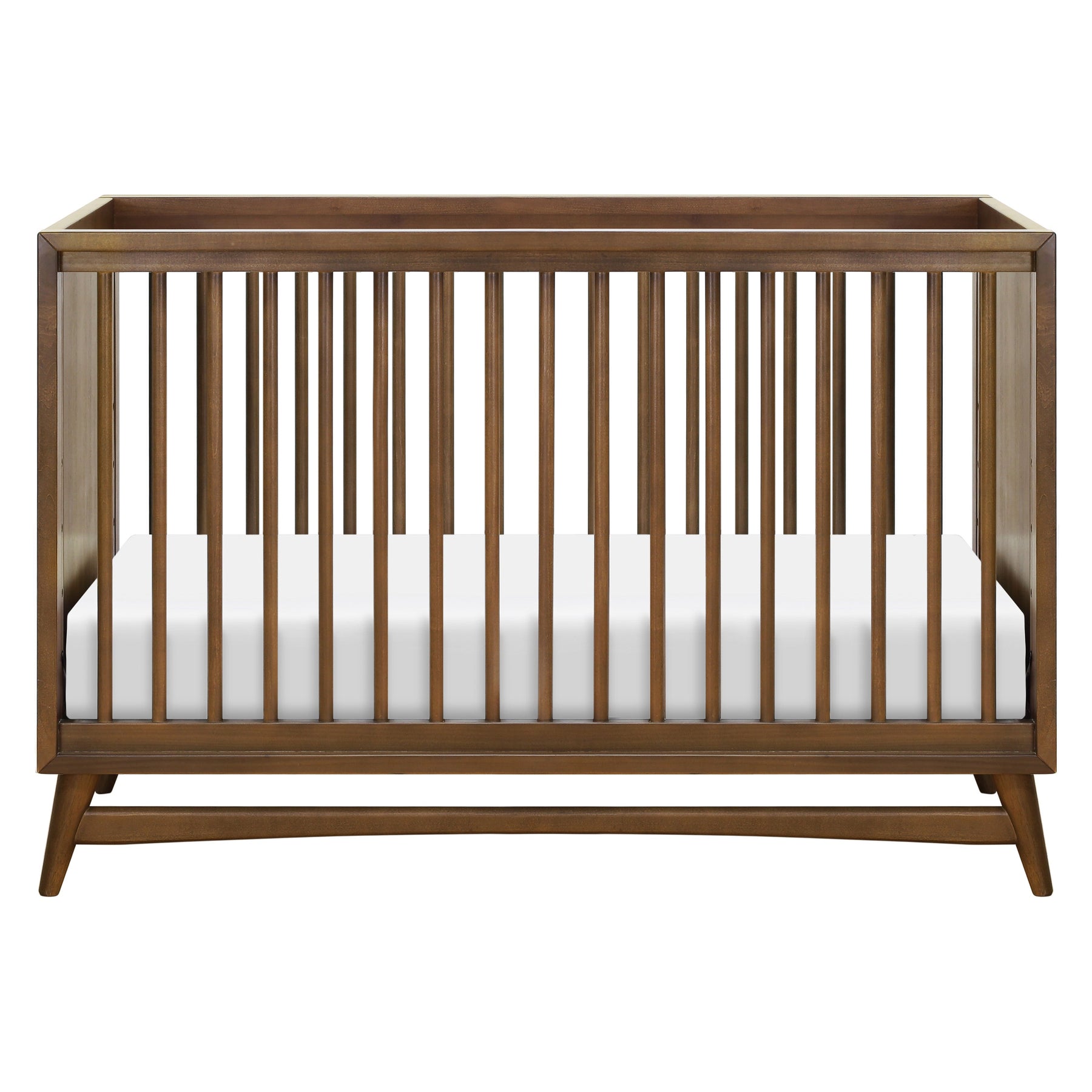 - REFINED MID-CENTURY MODERN STYLE: Featuring a modern, clean silhouette and classic rounded spindles. Flared tapered legs add a playful touch to this sophisticated crib.