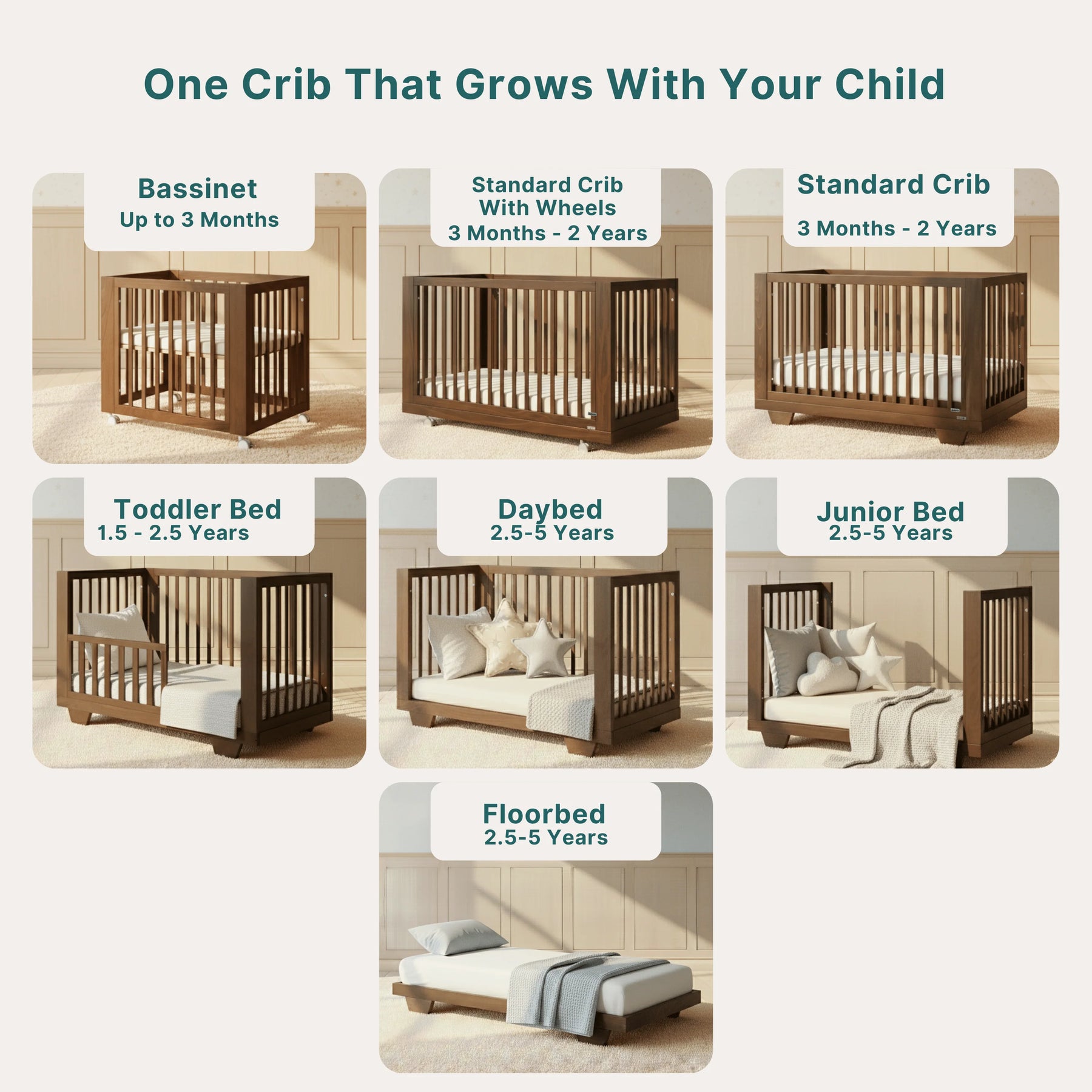 - Transforms with ease from a newborn cradle to a crib with removable wheels, and later into a toddler bed, daybed, and floor bed—all necessary toddler bed conversion pieces included.