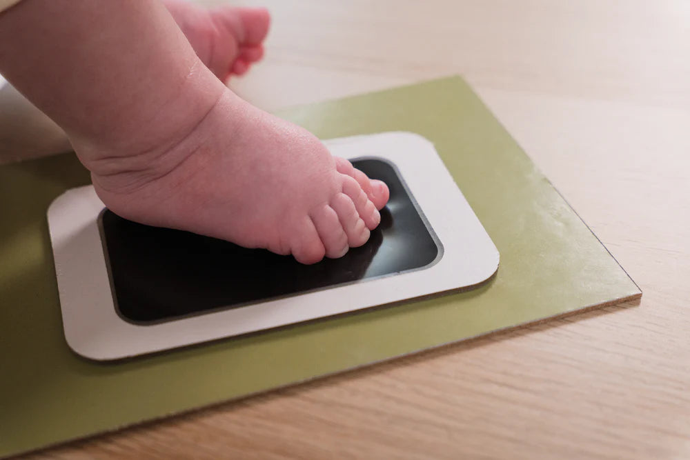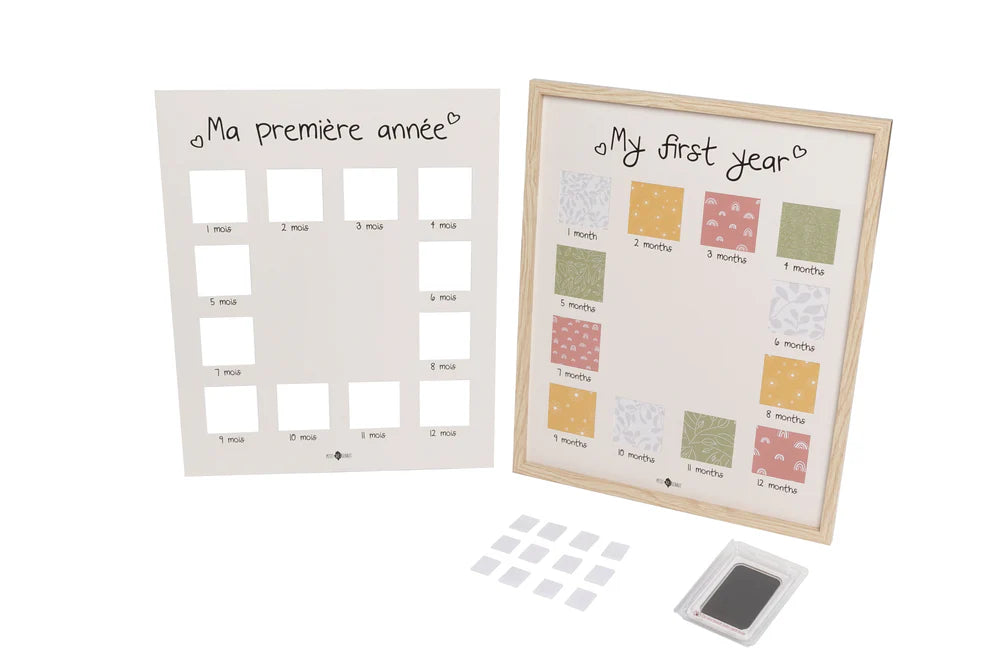 The My First Year Frame allows you to track baby's development month by month and proudly display photos of their growth over a year! With 12 windows which frame each milestone photo and a space in the center of the poster to make their first inkless prints, it's fully customizable. The My First Year Frame is reversible (English/French) and its background is decorated with Petit Artichaut motifs, adding a designer touch while waiting for the photos of the months to come. Included in the kit are an inkless stamp pad and instructions. The "Smart Inkless Touch" technology of the stamp ensures a lifelike print, without requiring baby's skin to touch any ink.