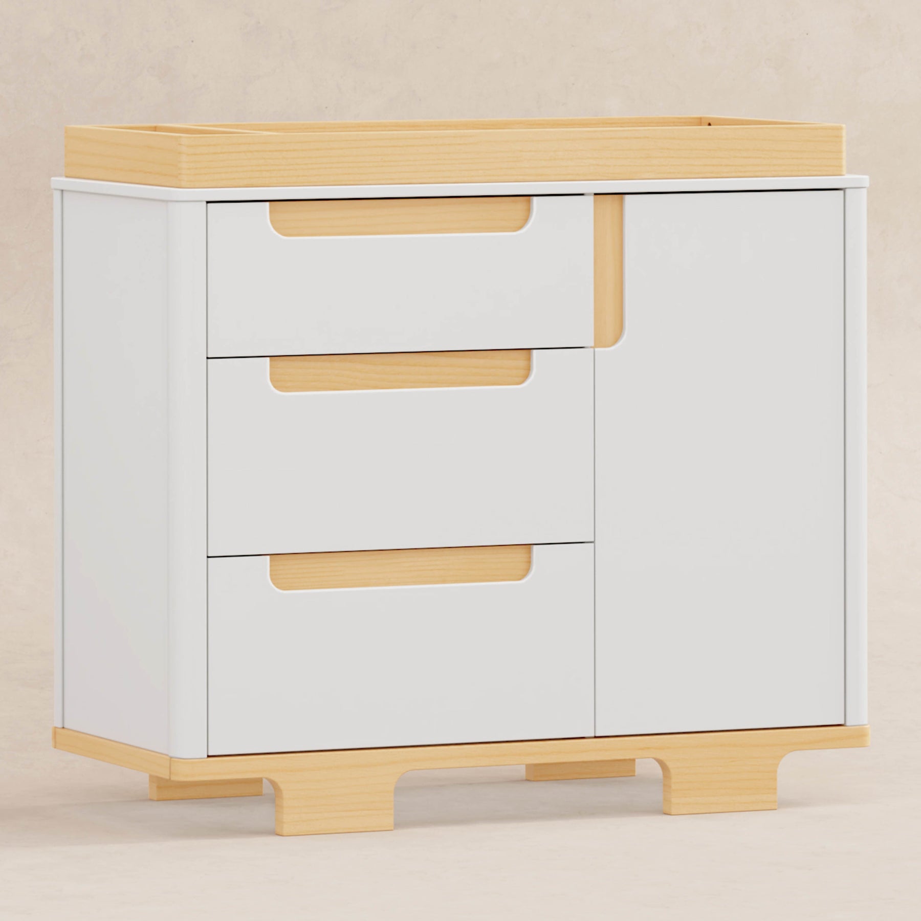 Designed to complement the Yuzu 8-in-1 All-Stages Crib, the Yuzu 3-Drawer Changer Dresser marries form and function with playful arched feet, gently curved corners, included changing tray, and plenty of storage with 3 drawers and 1 spacious cabinet. Whether you're going for a classic, modern, or eclectic look, this versatile dresser is a perfect statement piece in the nursery.