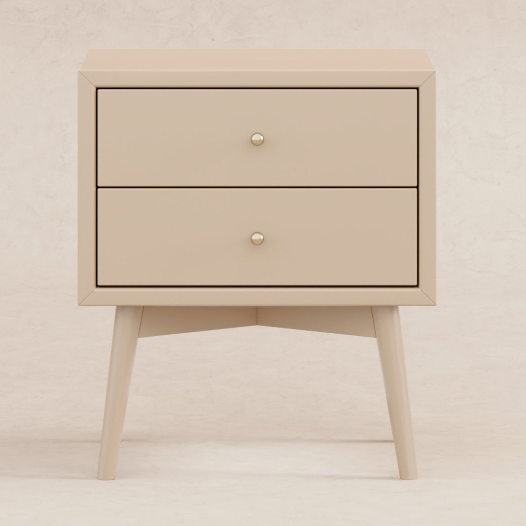 The Palma Nightstand with USB port and is a sophisticated mid-century inspired design with tapered legs, brushed metal hardware, and two smooth-glide drawers. Easy setup with minimal assembly required.