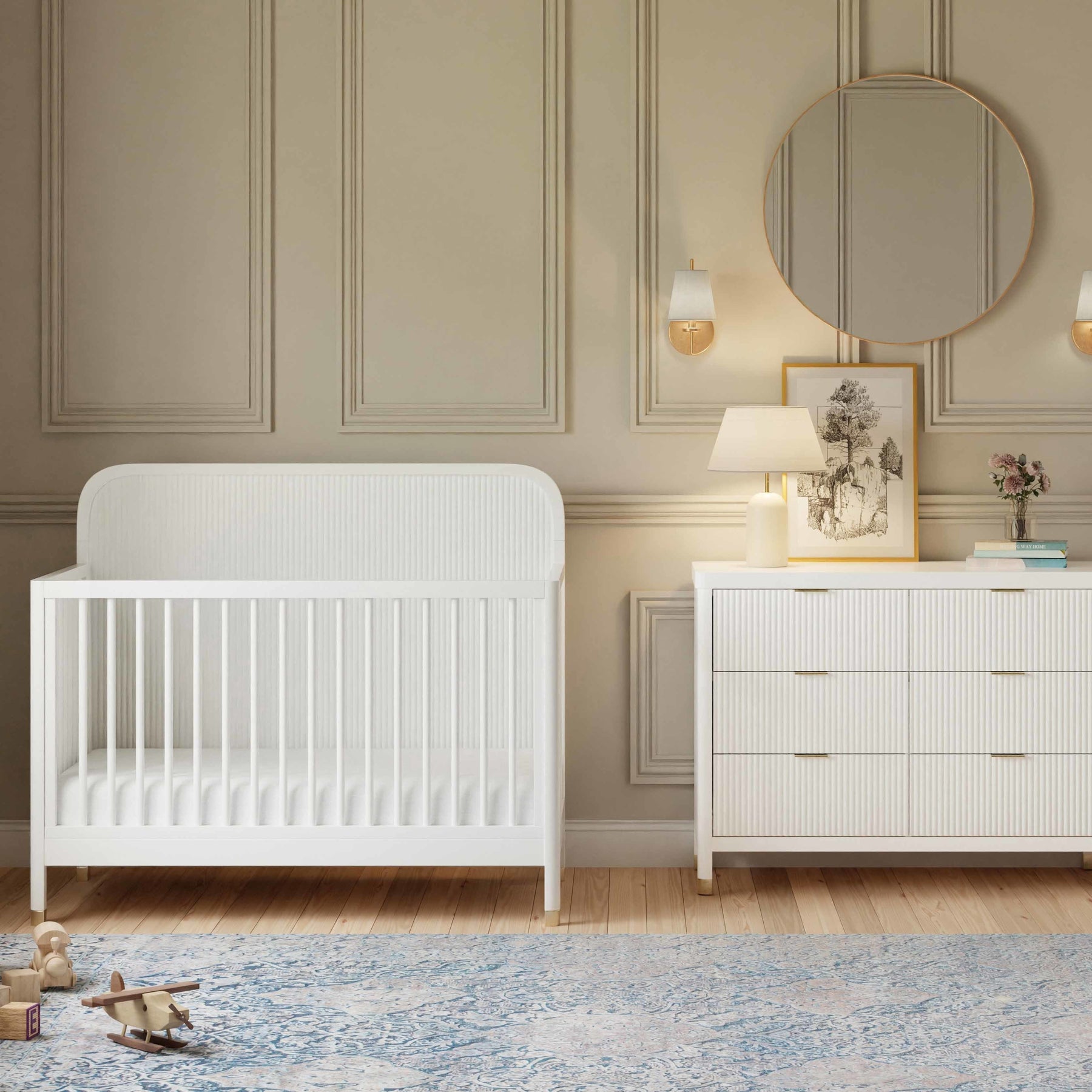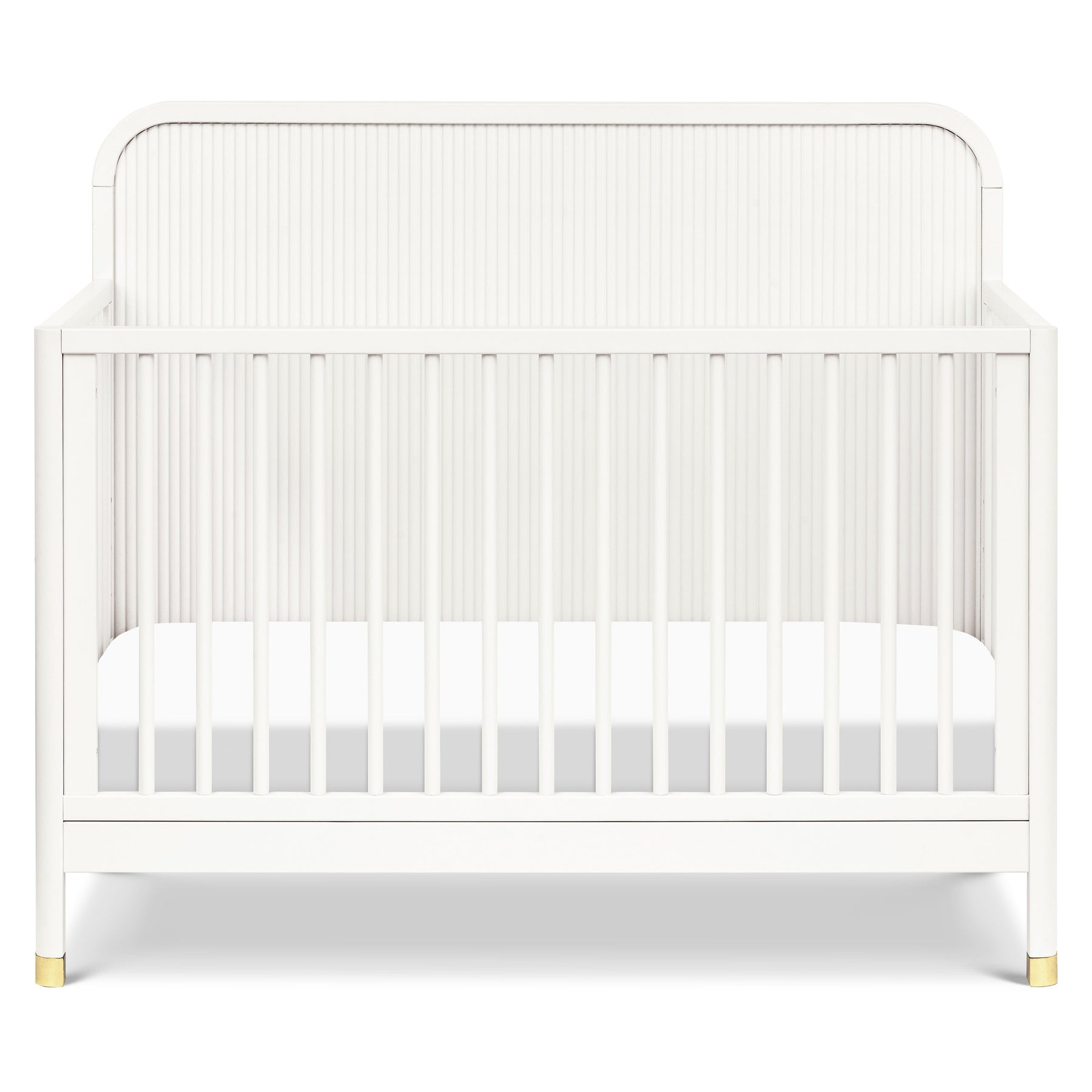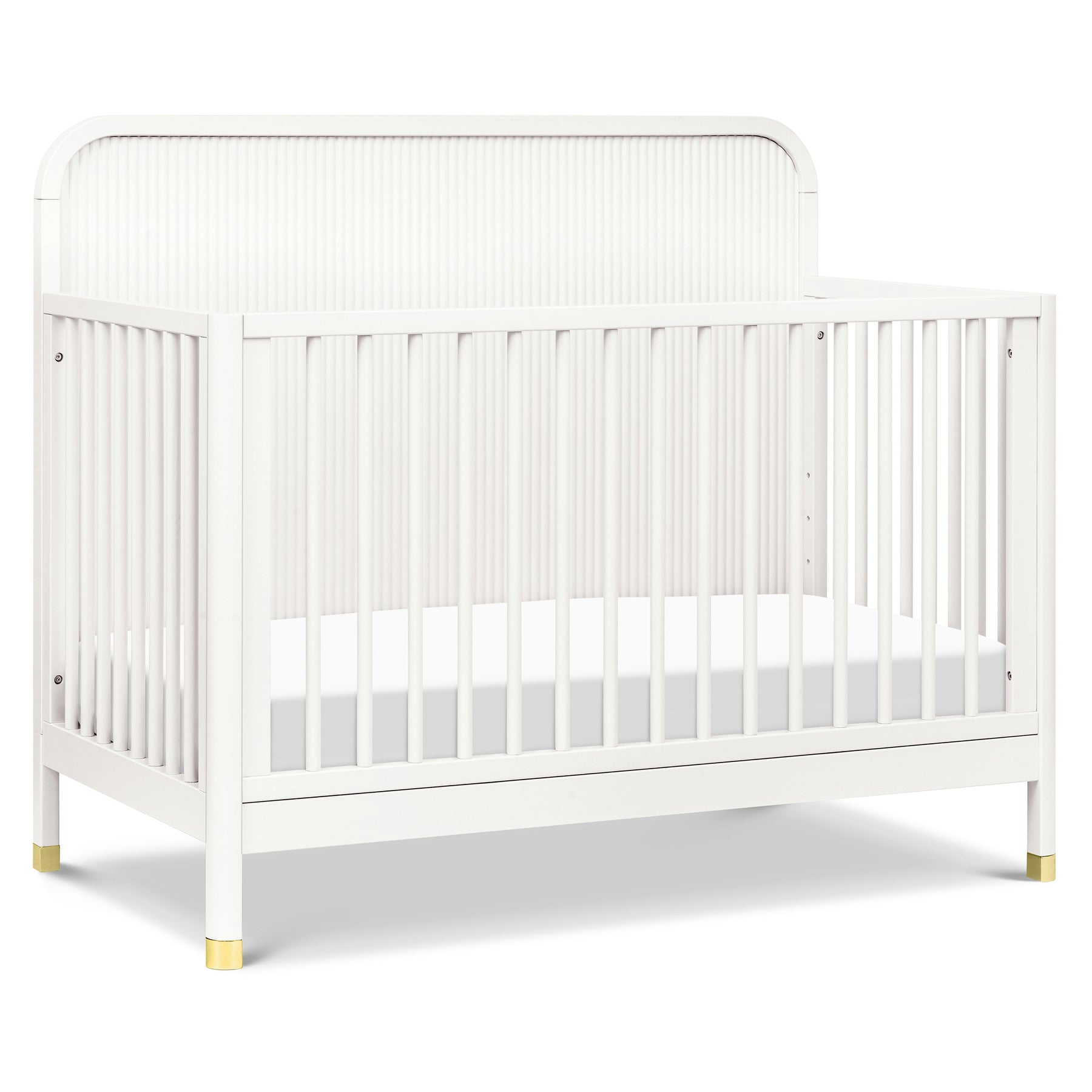 The Brimsley Tambour Crib is a masterpiece of craftsmanship that blends timeless design with modern functionality. Its distinctive tambour design and gently curved slats, paired with elegant gold feet, make this crib more than just a place for your little one to rest; it's a statement piece that elevates the aesthetic of your nursery.​