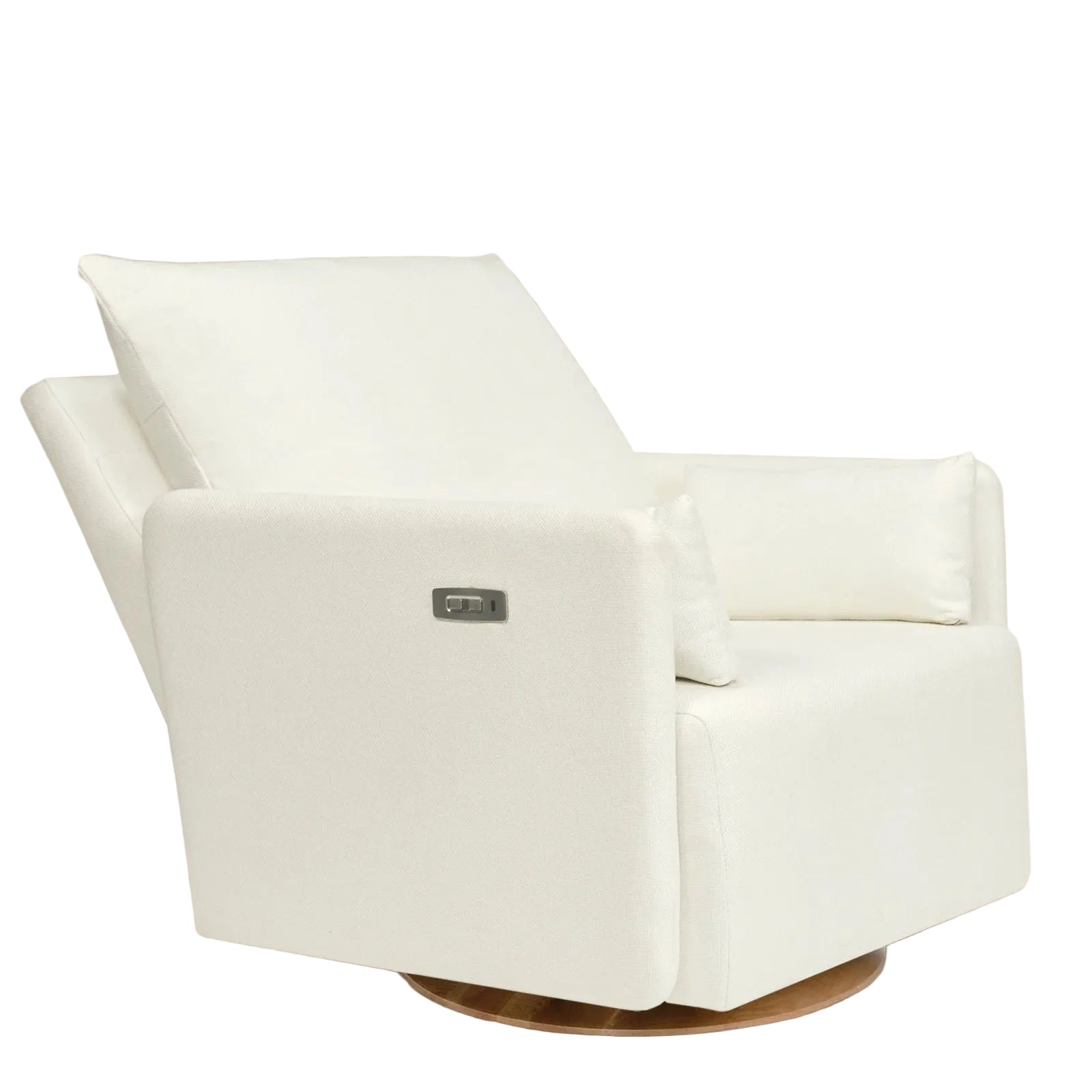 Our Ollie is available in two sizes - this is our Ollie: Standard Size - Swivel Nursery Glider with a Back Recline feature, measuring 4" more narrow. It has a 180º swivel motion and parallel rocking motion that gently glides, even while the back is reclined, allowing you to easily turn toward anything you might need to reach. Boasting removable side pillows and a plug-in smooth motorized recline back, this standard size Ollie is perfectly sized for one-on-one bonding and everyday comfort. Embrace style, comfort, and sophistication!