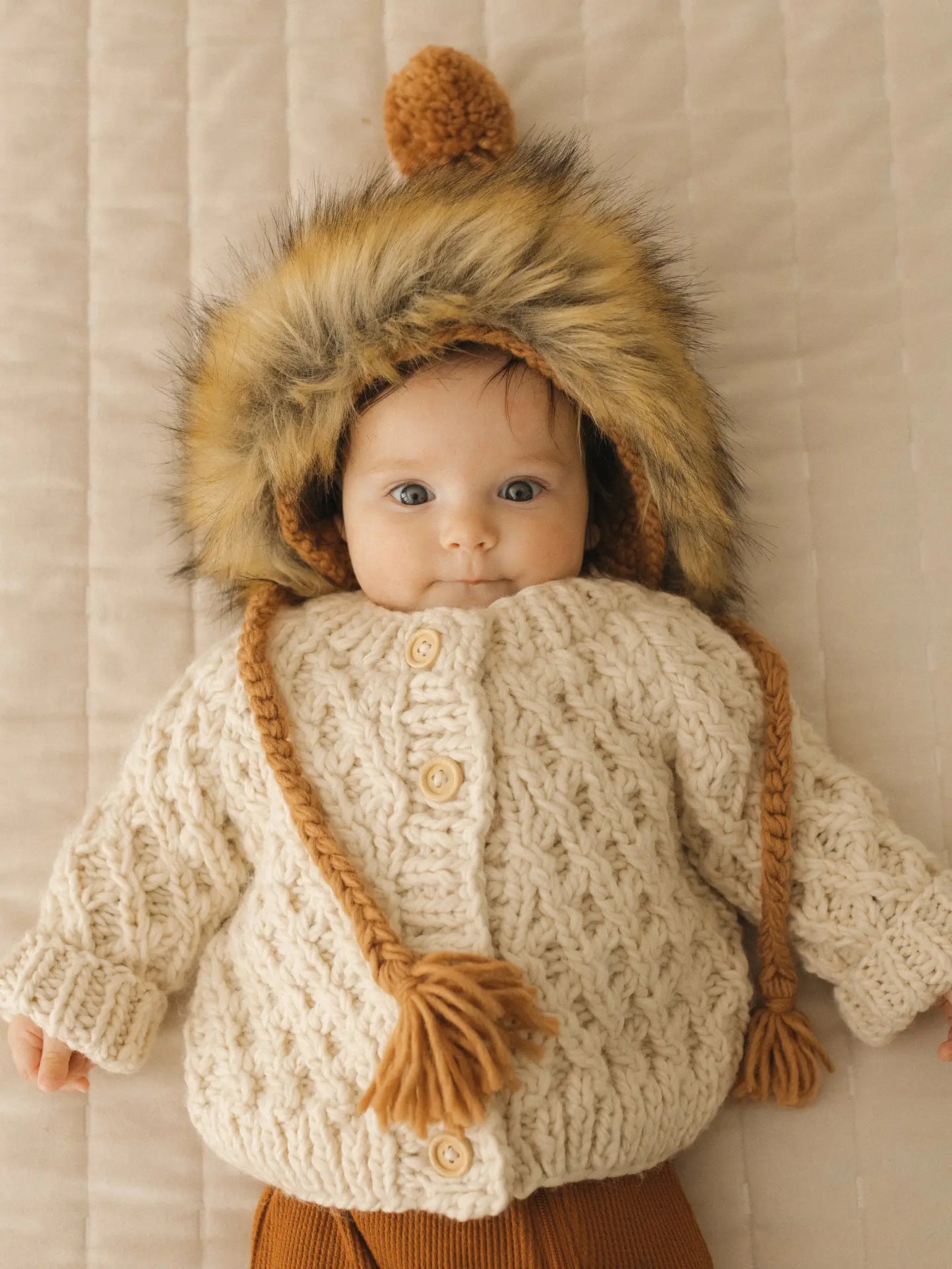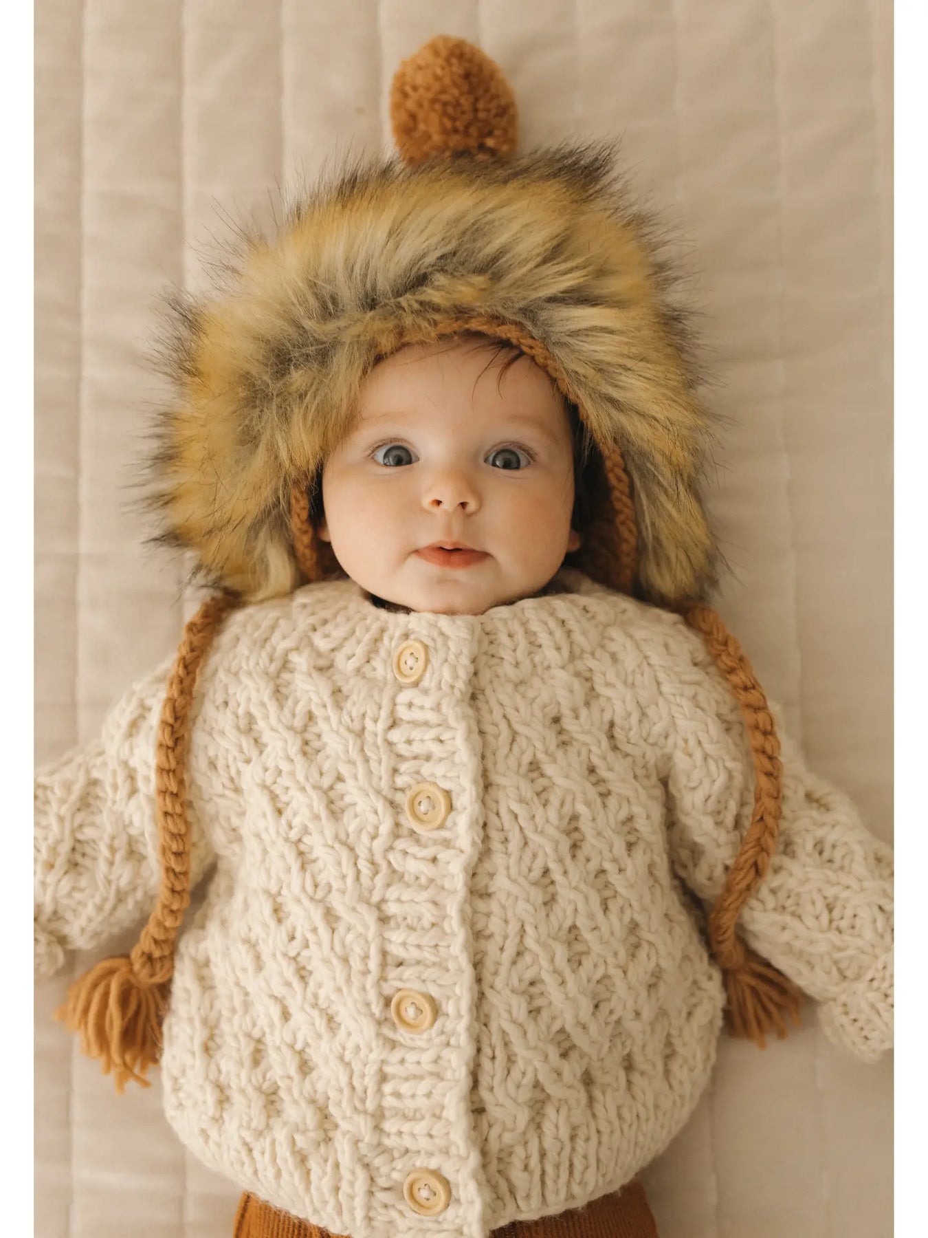 Trimmed in lush tan tipped faux fur, this stunning bonnet is hand knit in cozy Natural Icelandic yarn. It is trimmed with a fun pom pom and has string ties to keep the hat in place. What a perfect shower gift! Use it for photos, dress-up and costumes too.