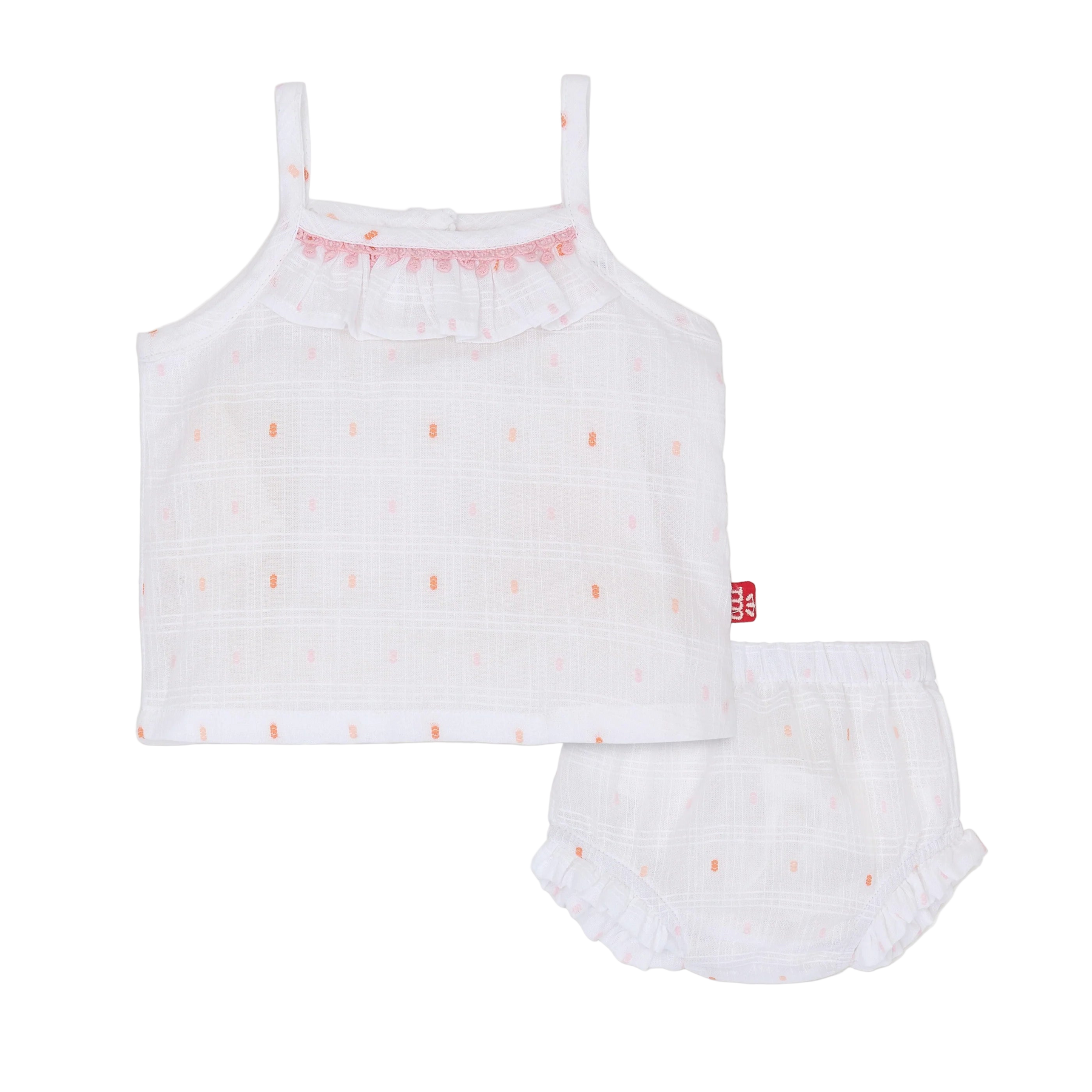 Bring on the warmer temps with our sleeveless cotton poplin Magnetic Dress & Diaper Cover Set. Made of soft, smooth 100% cotton poplin, it’s designed with magnets at the back of the neck for easy over-the-head dressing. The matching diaper cover creates a comfy yet coordinated look in no time flat.
