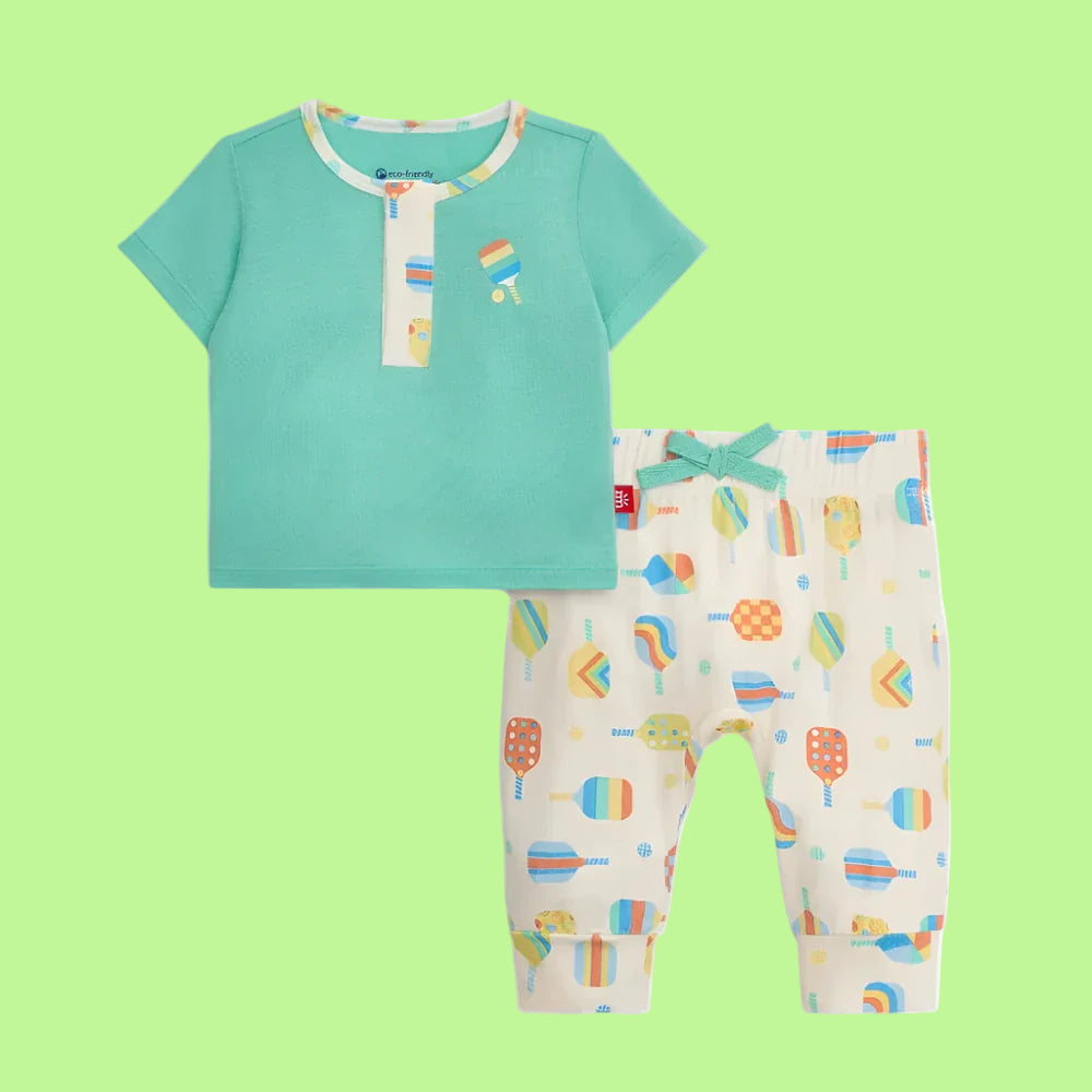 Warm weather calls for this modal Short Sleeve Top & Short Set featuring a comfy t-shirt that slips easily over the head, thanks to magnetic closures. Stretchy shorts have an elastic waist, making diaper changes equally fuss-free. This set comes in silky soft modal, an eco-friendly fabric loved for its natural temperature-regulating properties.