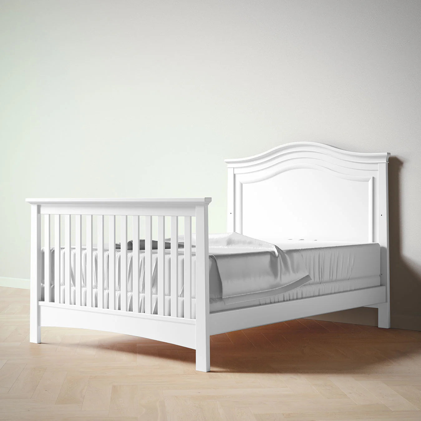 Serena Convertible Crib, sophistication springs from its simple style. Made from Solid Hardwood construction for longevity through the conversion stages. Serena is the instant classic, the design that grows on you. Arched headboard with subtle curves and perfect proportions, this 4 in 1 Convertible Crib transforms into a full size bed. Solid wood construction, finished with organic, non-toxic paints and stains.