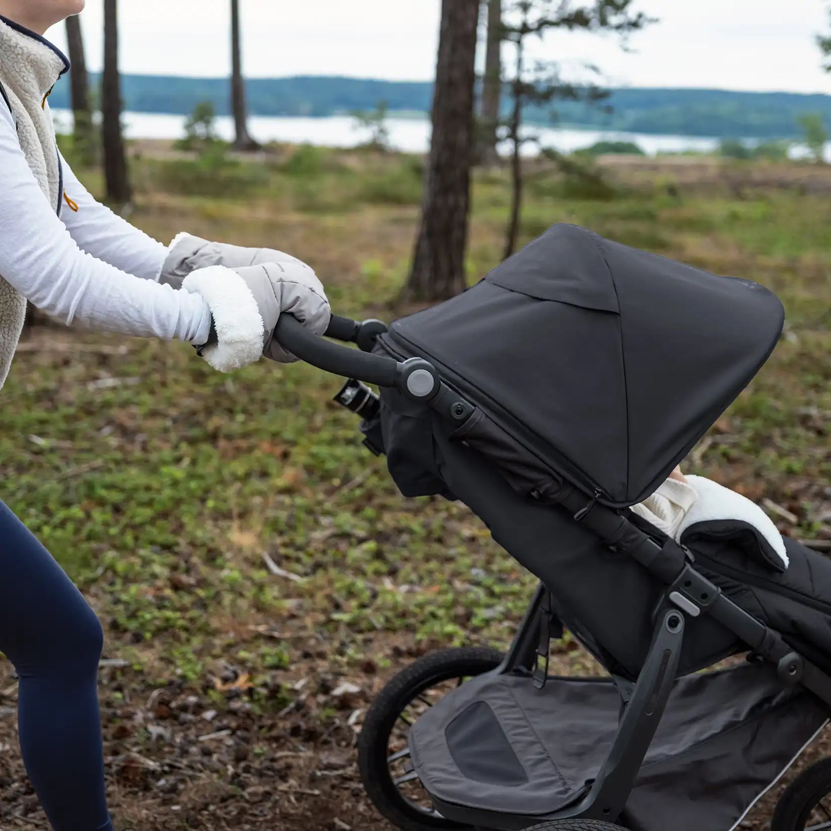 The CozyHandmuffs provide the ultimate protection for your hands while conveniently remaining attached to your stroller handlebar when you need to tend to your little one.