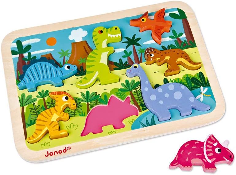 DISCOVER DINOSAURS : with this wooden puzzle, your child will be amazed by discovering dinosaurs : its seven integrated pieces and pretty illustrations will delight little ones : these impressive prehistoric reptiles are waiting for them
